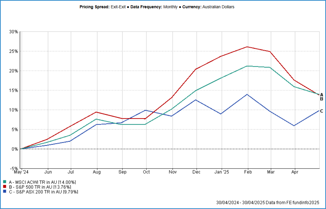 The chart below shows the performance over 1 year to 30 April 2025 for the US stock market (in red); global shares (in green) and Australian shares (in blue).