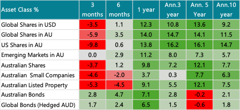 One year returns on growth assets are good except for Australian resources, which did poorly given concerns over China’s growth prospects and falling commodity prices. Bond returns have been volatile but consistently positive across all periods of up to three years.
